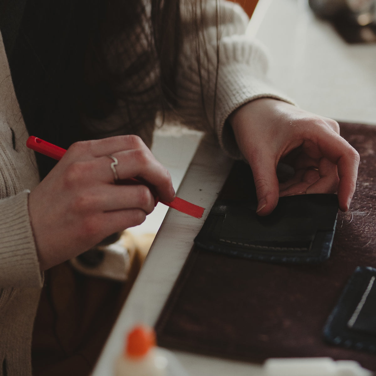 We use a skiver to reduce the bulk of certain parts of your wallet to minimize it's feel in your pocket and maximize it's function. Next, we glue up the pockets before they're ready to be handsewn.