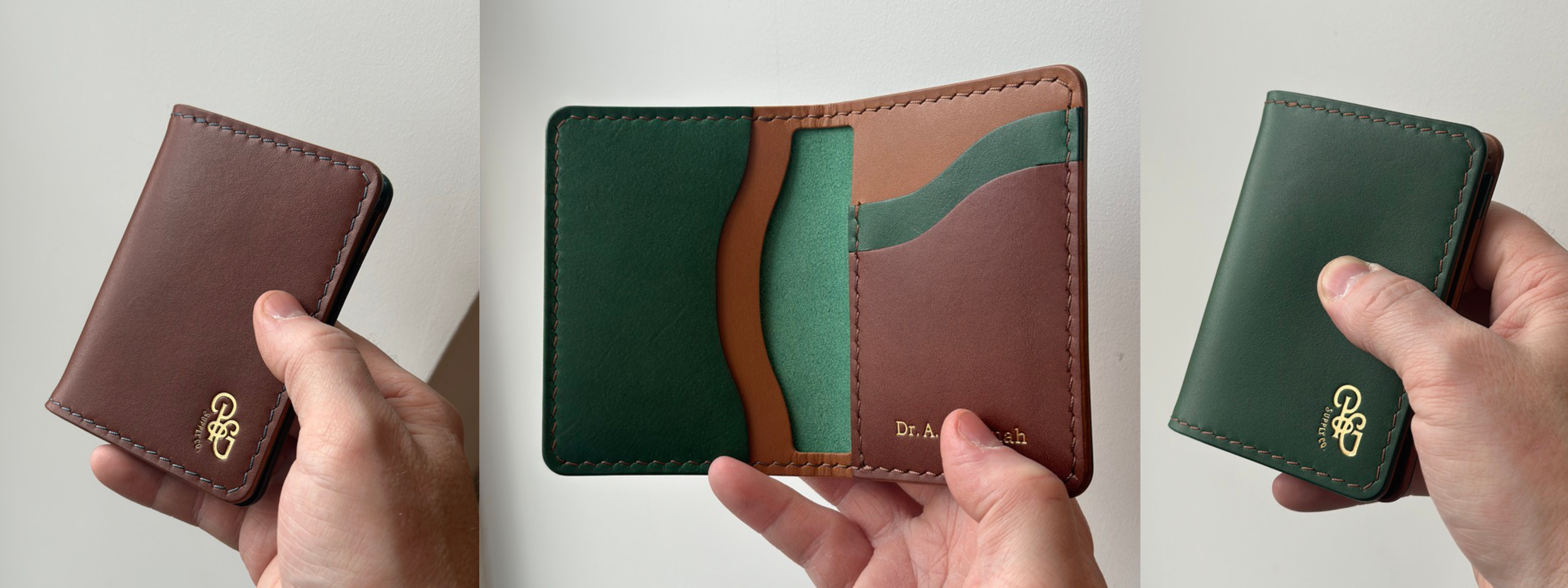 Each stitch hole is punched by hand with pricking forks. We hand sew the wallets, using the tried-and-true saddle-stitch technique.