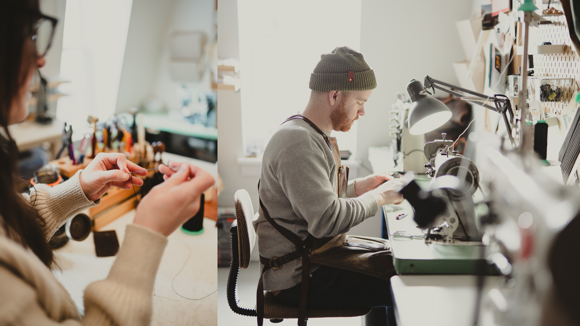 Each stitch hole is punched by hand with pricking forks. We hand sew the wallets, using the tried-and-true saddle-stitch technique.