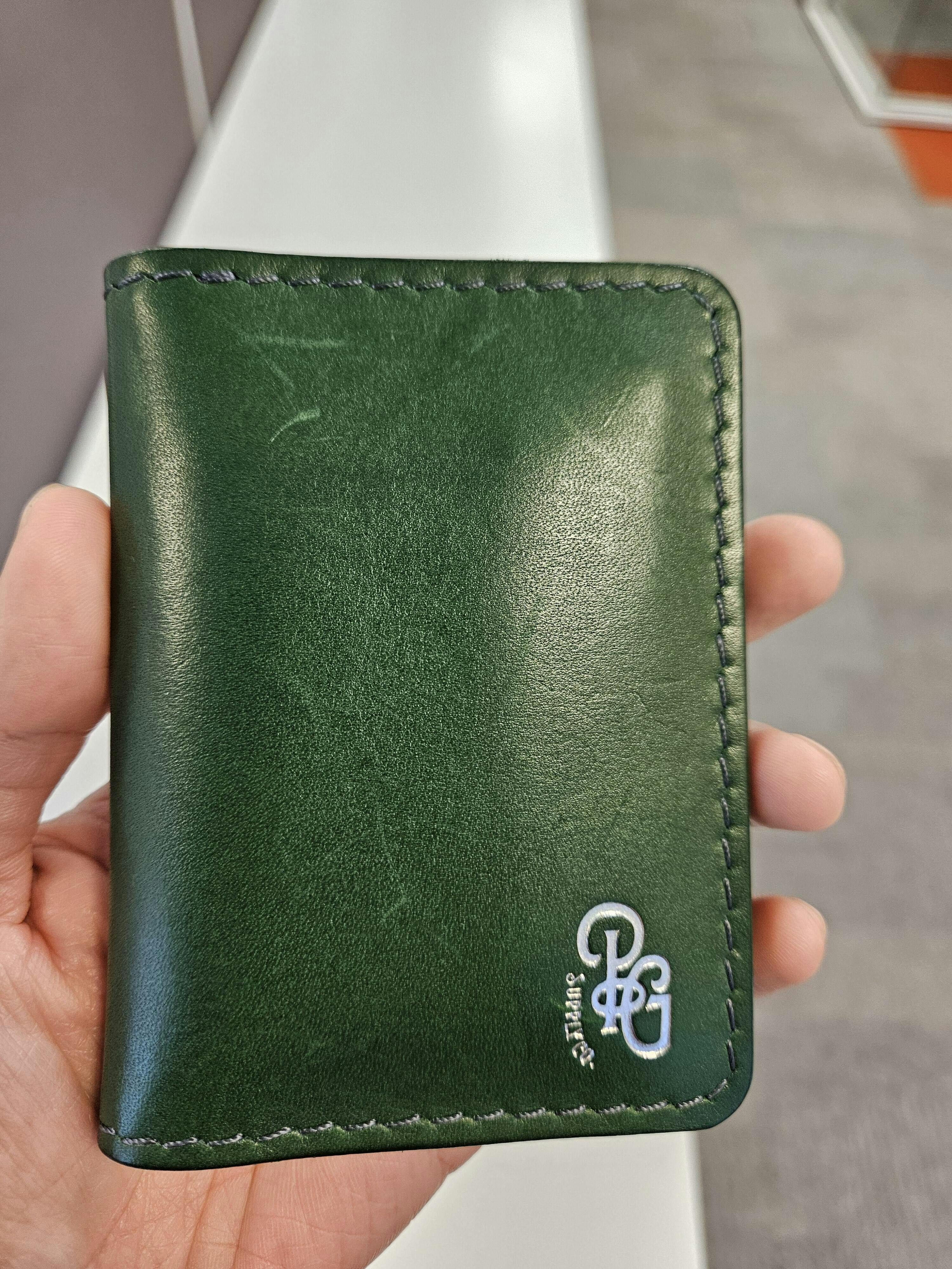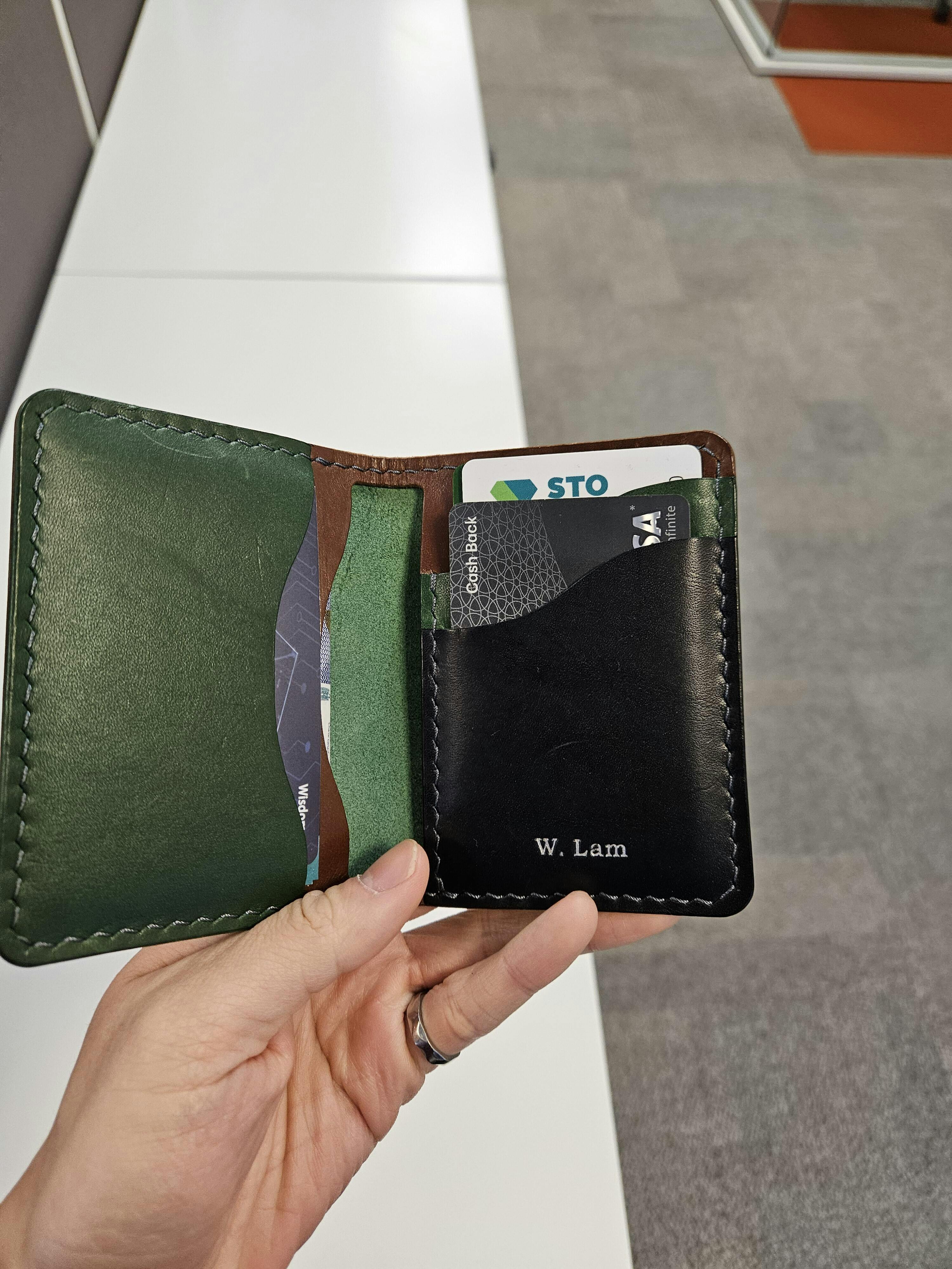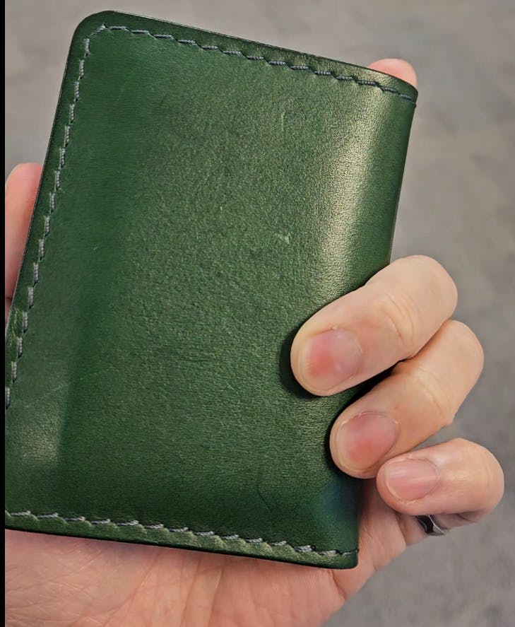 You pick your colours, and we cut out each pocket individually. The pockets are then assembled using hand tools and traditional techniques. Each panel is hand sewn with your choice of thread colour using a saddle stitch and the edges are burnished by hand. Burnishing begins the patina which is the aging process that makes your wallet even more unique to you.